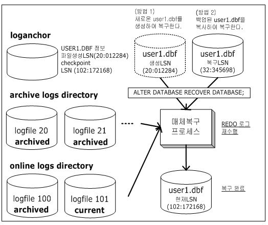 테이블스페이스의 모든 데이터 파일 | ① 유닉스 명령어 cp 수행 ② ALTER DATABASE RECOVER DATABASE; |
