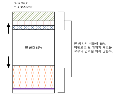 PCTFREE 제한에 걸리게 되면, 해당 페이지에는 사용 공간의 비율이 PCTUSED 보다 낮아지기 전까지 새로운 로우를 입력할 수 없고, 이 페이지 내의 빈 공간은 오직 갱신 연산을 위해서만 사용된다. 이 상태는 사용 공간의 비율이 PCTUSED값 아래로 떨어질 때까지 지속된다.