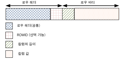 로우 헤더에는 18 byte 크기의 헤더 정보가 저장된다. 연결된 로우 조각 (chained row piece)일 경우에는 6 byte의 ROWID 정보가 추가적으로 저장된다.