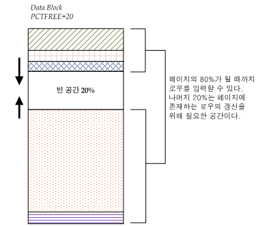 예를 들어 PCTFREE 값을 20으로 설정하면, 페이지의 80% 공간까지만 입력할 수 있고, 나머지 20%의 공간은 기존의 로우들이 갱신될 때 사용을 위해서 남겨둔다.