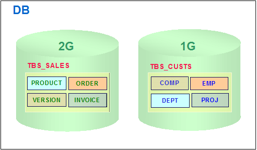 다음 그림은 데이터베이스 내에서 테이블스페이스를 업무단위 및 백업사이즈를 고려하여 적정사이즈로 분리하여 생성한 것을 보여준다.