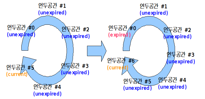 그림은 언두 공간 #0부터 시작해서 순서대로 사용되면서 현재(Current)의 언두 공간 #5을 사용하고 있는 것을 나타낸다. 그리고 다음 차례의 언두 공간 #0이 만료된 것을 확인하고, 언두 공간 #5를 모두 사용하면 언두 세그먼트를 더 이상 확장하지 않고 언두 공간 #0을 재사용한다.