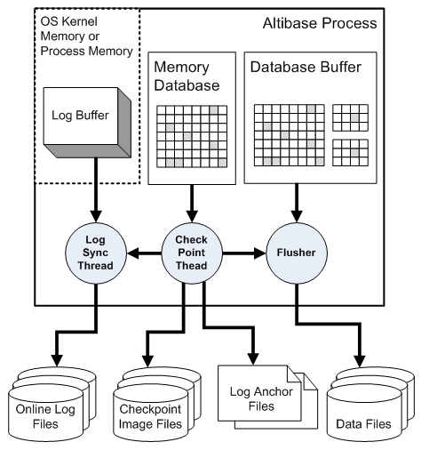 아래의 그림은 체크포인트가 발생할 때 Altibase 프로세스 내에서 체크포인트를 수행하는 쓰레드들의 동작을 보여준다.