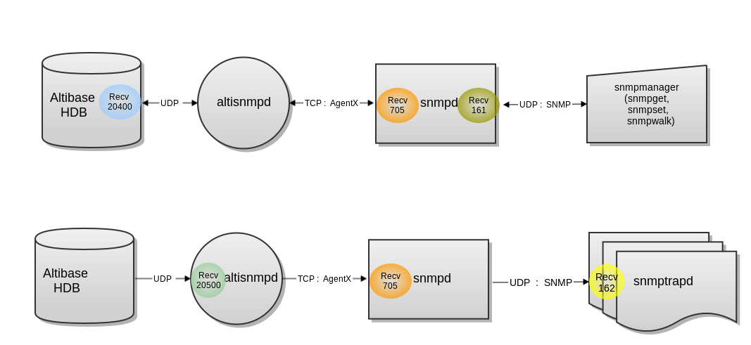 위의 그림은 SNMPManager를 이용해 알티베이스 MIB를 가져오는 구조이다. (포트번호는 net-snmp가 기본) Sync 방식이며 SNMPManager에서 UDP 161 포트로 요청을 보내면 snmpd에서 다시 TCP 705 포트로 altisnmpd에 요청을 전달한다. altisnmpd는 최종적으로 UDP 20400 포트로 Altibase에 요청을 전달하고 응답을 받아 snmpd에게 전달하고 최종적으로 snmpmanager에게 전달한다.