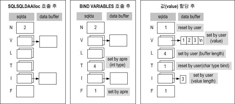 - BIND VARIABLES을 통해 얻은 파라미터 정보에 해당하는 데이터를 SQLDA 구조체에 저장한다.