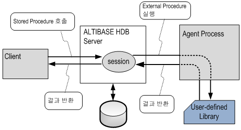 에이전트 프로세스는 외부 프로시저와 관련된 동적 라이브러리 파일을 로딩하고 라이브러리 내의 관련 C/C++ 함수를 실행하여 결과를 Altibase 서버로 전달하면 Altibase 서버가 클라이언트에 그 결과를 반환한다.
