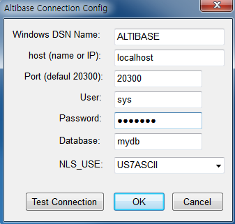 Port (default 20300): Altibase 서버의 listening 포트 번호를 입력한다. altibase.properties 파일에서 PORT_NO 값을 확인하거나 ALTIBASE_PORT_NO 환경변수 값을 확인한다.
