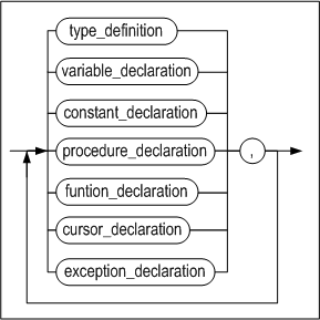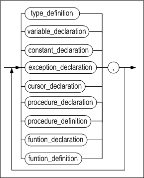 사용자 정의 타입을 정의하거나, 변수, 상수, 서브 프로그램(프로시저 또는 함수), 커서 및 예외를 선언한다. type_definition의 문법은 6장의 "사용자 정의 타입의 정의"절을 참고하고, variable, constant, cursor, 및 exception 선언절의 문법은 3장의 "지역 변수 선언"절을 참고하기 바란다.