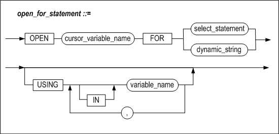 이 구문은 커서변수 (REF CURSOR)를 초기화하고 쿼리를 수행하여 결과 집합을 결정하는 데 사용된다. 결과 집합의 데이터는 FETCH 문을 사용해서 가져올 수도 있고, 저장 프로시저의 인자를 사용해서 클라이언트로 전달할 수도 있다. USING 절을 이용하여 인자를 바인딩할 수도 있다.