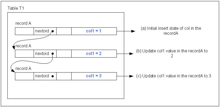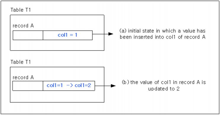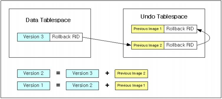 In the case of disk tablespace, the size of the data tablespace does not increase much if a great number of update operations occur in a short period of time. However, because the effect of in-place MVCC is to increase the number of undo log records, the amount of space being used in the undo tablespace would increase in this situation. Because the size of the undo tablespace is set when the CREATE DATABASE statement is executed, and cannot be changed, it is necessary to reuse undo log records. Undo log records are registered in the undo tablespace header when transactions are committed, and are managed in a linked list. When it is no longer necessary to refer to undo log records pertaining to particular transactions, the records are cleared from the system. In contrast, when a transaction is rolled back, the undo log records are cleared immediately instead of being registered in the undo tablespace.