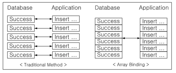 The following figure briefly illustrates the Array Binding. It can be seen that the number of network transmissions is reduced, allowing more data to be transmitted in a shorter time.