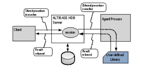 When the stored procedure that registered an external procedure is invoked in the client session, the Altibase server starts the Agent Process for external procedures. And when the execution of external procedures is complete, the Altibase server stands by for a while and, if no other external procedure is being executed, terminates the Agent Process.