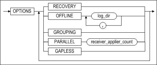 This is used to optionally specify the RECOVERY, OFFLINE, GROUPING, PARALLEL, and GAPLESS functions for the replication object. These features are for use in data recovery and when performing offline replication, respectively. For more information, please refer to Chapter 3 of the Replication Manual.