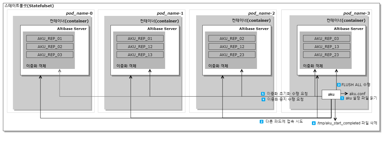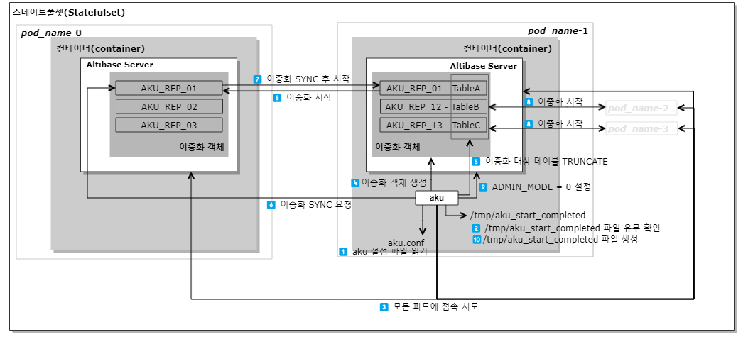 Altibase Kubernetes Utility (AKU) is a utility that helps you perform tasks such as synchronizing data in Altibase with the start and termination of Pods or resetting synchronization information when scaling in a Statefulset in Kubernetes. Aku supports data replication among Pods but does not support Altibase's data scale-out feature.