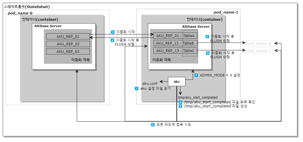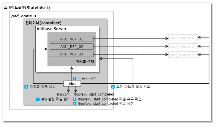 When scaling up or down on a StatefulSet, you can use aku to start or terminate pods that meet the following conditions. You should add the command in the appropriate location so that aku runs on the Altibase container.