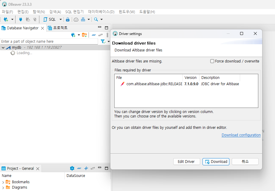 Database Navigator 에 추가된 Altibase 연결 정보(mydb)를 더블 클릭하면, Altibase의 JDBC 드라이버 파일을 다운로드 할 수 있는 Driver settings 창이 열린다. 다운로드하려는 JDBC 드라이버를 선택한 다음, [Download]를 클릭한다.