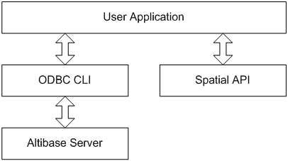 아래 그림과 같이 Spatial API는 Altibase 서버 및 ODBC CLI 와 어떠한 호출 관계도 존재하지 않으며, 공간 데이터를 생성하고 해석하기 위하여 사용한다.