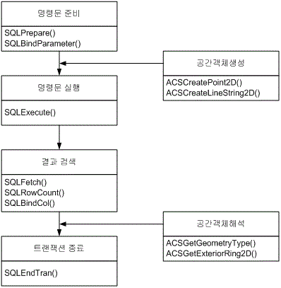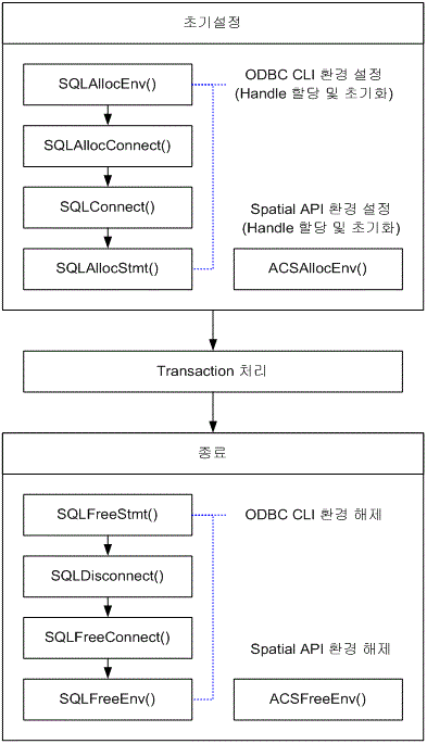 다음은 일반적인 ODBC CLI를 이용한 SQL 처리 절차이다. 이 ODBC CLI호출의 중간에 공간 생성 함수나 공간 검색함수들을 호출하여 처리한다.