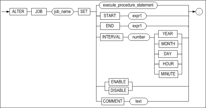 CREATE JOB 구문으로 생성한 JOB의 정의를 변경할 수 있다. 이 구문으로 JOB에 등록된 프로시저의 실행 구문, JOB의 시작 시간과 끝나는 시간, JOB의 실행 주기 등을 변경할 수 있다.