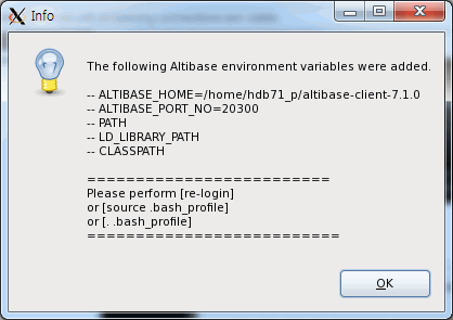 이 과정 동안 위 다이얼로그 박스에서 보여주는 Altibase 클라이언트 제품과 관련 있는 환경 변수는 로그인 쉘 (예. 표준 본 쉘을 위한 기본 환경 파일은 .profile이다)을 위한 환경 파일에 추가된다. Altibase 서버 제품 설치 시에 생성되는 altibase_user.env 파일은 여기에서는 생성되지 않는다. 새로운 환경 변수를 적용하려면, 다음 중 하나를 수행한다.