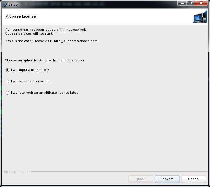 아래는 Altibase의 라이선스 키를 입력하는 화면이다. Altibase 패키지 인스톨러는 라이선스 키를 입력하는 다음 세 가지 방법을 제공한다.