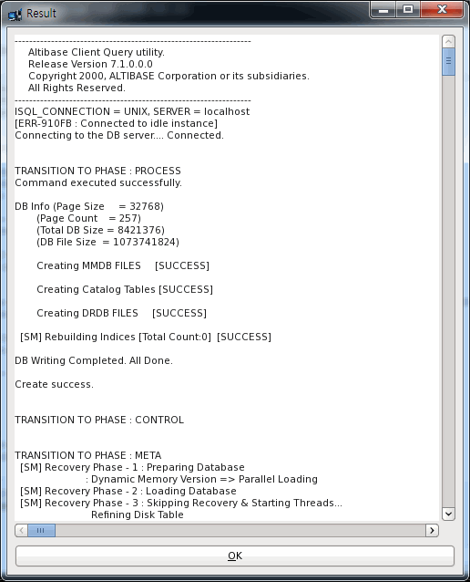 $ isql -s 127.0.0.1 -u sys -p manager -silent -f ${ALTIBASE_HOME}/packages/catproc.sql