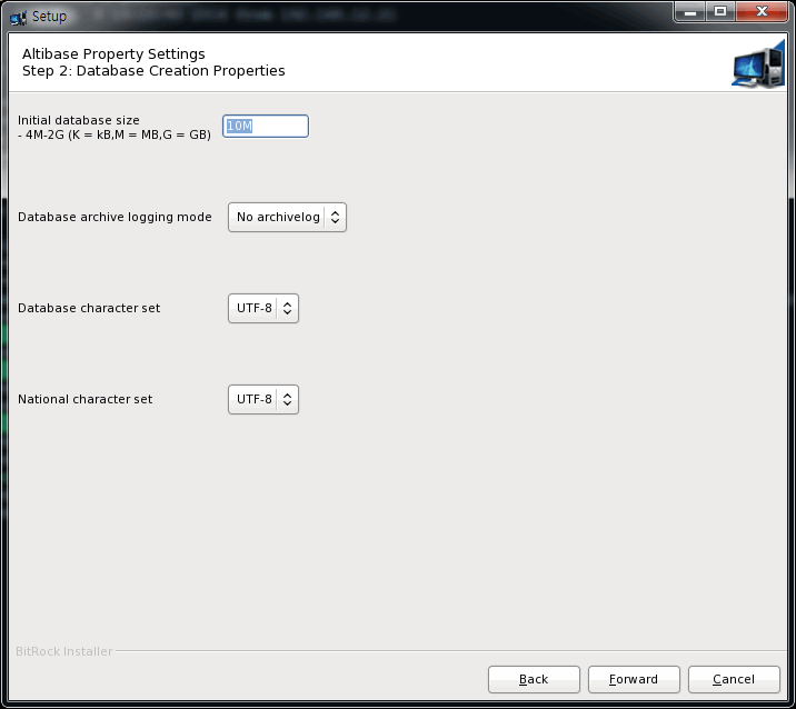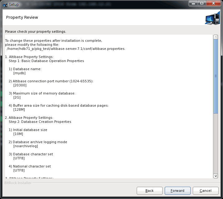 a database after installation, at "Altibase Property setting step 1",