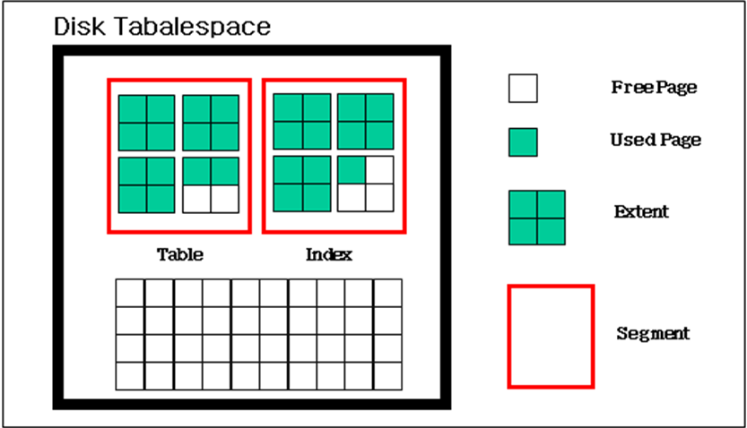 디스크 테이블스페이스는 논리적으로 세그먼트, 익스텐트 및 페이지로 구성된다. 이들의 관계를 살펴보면 아래 그림과 같다.