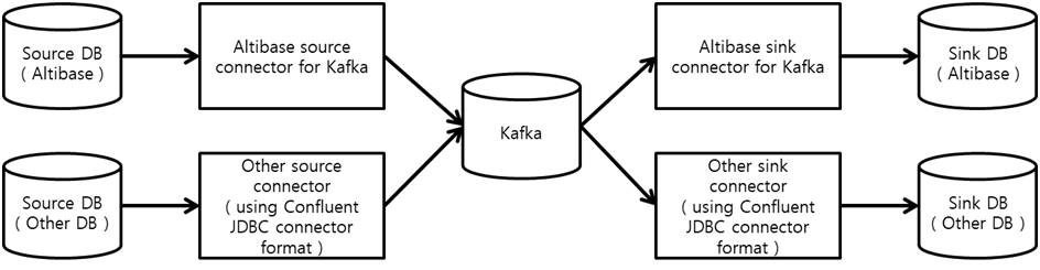 사용자가 Kafka를 통해 Altibase에서 변경된 데이터를 다른 데이터베이스로 복제하거나, 다른 데이터베이스에서 변경된 데이터를 Altibase로 복제하기 위해서는 아래 그림과 같이 source connector 와 sink connector가 필요하다.