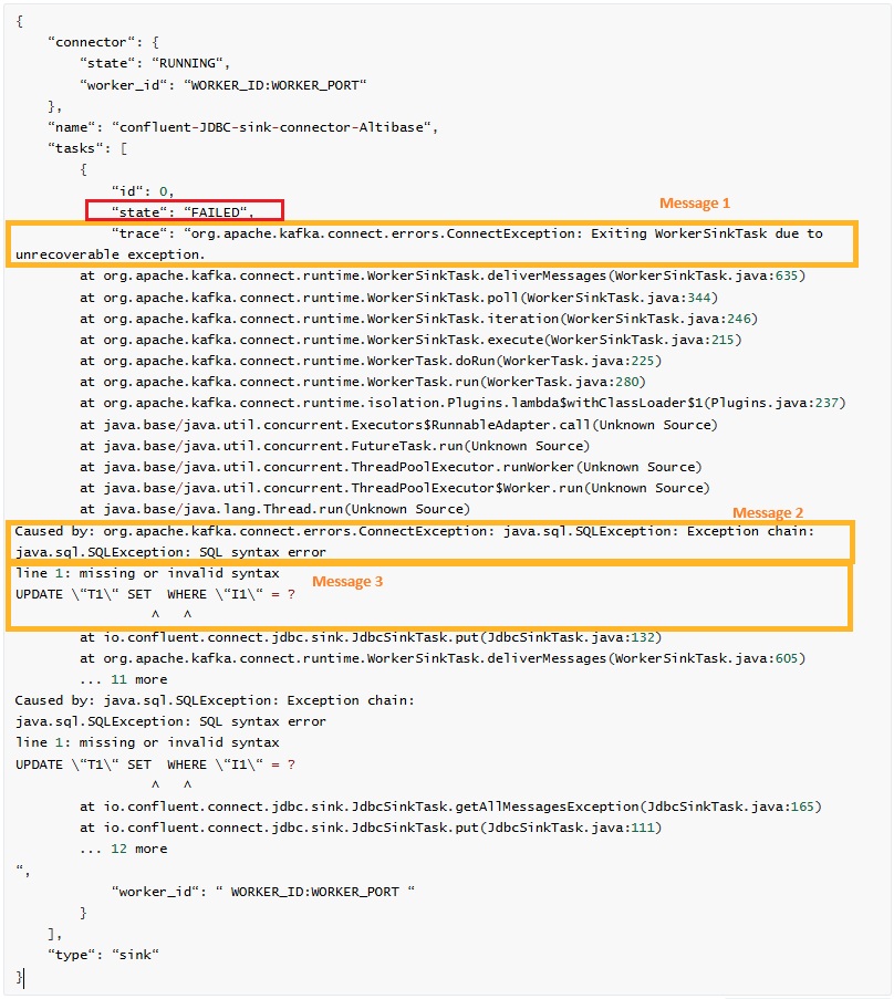 싱크 커넥터는 Kafka 에러 -> JDBC 드라이버 에러 -> DB 엔진 에러 순으로 예외가 중첩되어 전달된다. 따라서 로그의 첫출(Message1) 보다는 Message 2, Message3에 해당하는 실제 원인을 확인하고 대처한다.