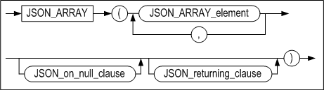 리스트형태의 값을 인자로 받아서 JSON 배열을 생성하여 반환한다. JSON_ARRAY 함수의 인자로는 JSON 객체, JSON 배열, SQL 스칼라, BOOLEAN, NULL을 사용할 수 있다. JSON_on_null_clause 와 JSON_ARRAY_returning_clause를 지정할 수 있다.