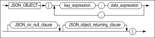 키와 값의 쌍을 인자로 받아 JSON 객체를 생성하여 반환한다. 키는 문자형 값만 사용할 수 있으며, NULL은 키로 사용할 수 없다. 값은 키와 짝을 이루는 값으로 문자형, 숫자형, JSON 객체, JSON 배열, BOOLEAN, NULL을 사용할 수 있다. JSON_on_null_clause 와 JSON_OBJECT_returning_clause 를 지정할 수 있다.