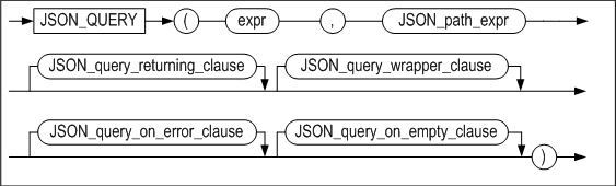 JSON 문서에서 JSON 경로 표현식에 해당하는 값을 찾아서 반환한다. JSON_QUERY_returning_clause, JSON_QUERY_wrapper_clause, JSON_QUERY_on_error_clause, JSON_QUERY_on_empty_clause 를 지정할 수 있다.