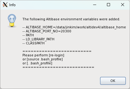 이 과정 동안 위 다이얼로그 박스에서 보여주는 Altibase 클라이언트 제품과 관련 있는 환경 변수는 로그인 쉘 (예. 표준 본 쉘을 위한 기본 환경 파일은 .profile이다)을 위한 환경 파일에 추가된다. Altibase 서버 제품 설치 시에 생성되는 altibase_user.env 파일은 여기에서는 생성되지 않는다. 새로운 환경 변수를 적용하려면, 다음 중 하나를 수행한다.