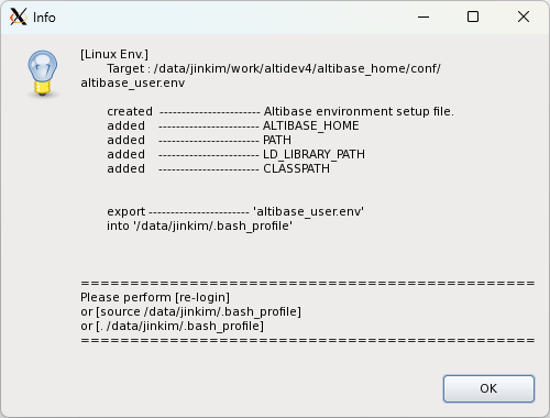 Altibase 서버 구동을 위한 기본 환경이 수록되어 있는 altibase_user.env 파일이 $ALTIBASE_HOME/conf 디렉터리에 생성된다. 그리고 이 파일을 실행하는 명령어가 사용자 계정의 환경 설정 파일(.bashrc 또는 .bash_profile 또는 .profile 등)에 추가된다.