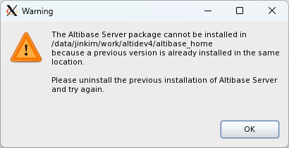 사용자가 입력한 디렉터리에 Altibase 제품이 이미 설치되어 있다면, 경고 메시지가 다이얼로그 박스에 보여진다. 이 경우 다른 디렉터리를 선택하든지, 그 디렉터리에 설치된 제품을 먼저 언인스톨 해야한다.