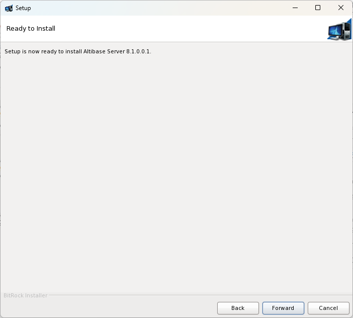 이 값들을 확인 후에, "Forward" 를 클릭하면 "Ready to Install" 패널이 아래처럼 보여질 것이다.