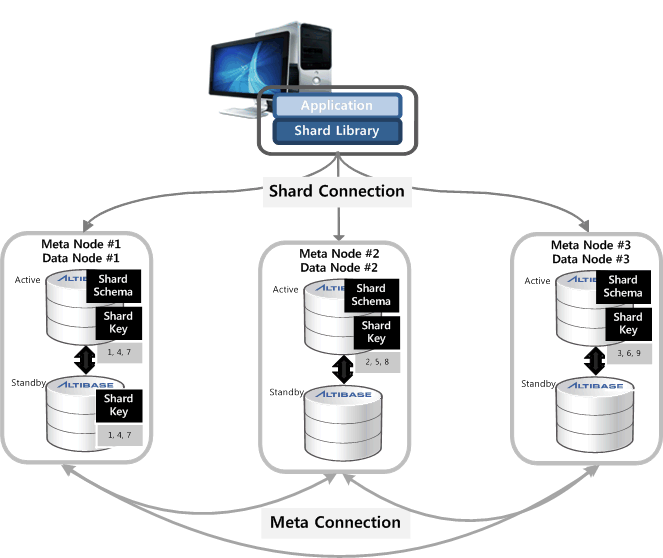 일반적인 샤딩은 샤드 테이블에 한해 물리적 데이터 분산만 적용하지만, Altibase Sharding은 샤드 프로시저를 분산하여 수행할 수 있다.