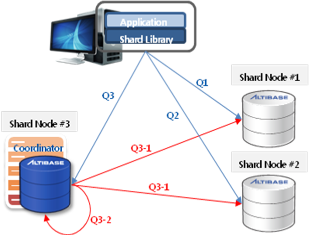 Altibase Sharding은 스케일아웃을 위하여 가능한 한 샤드 쿼리를 샤드 라이브러리를 사용하여 하이브리드 샤딩(클라이언트측 샤딩)으로 수행하는 것을 권장한다.