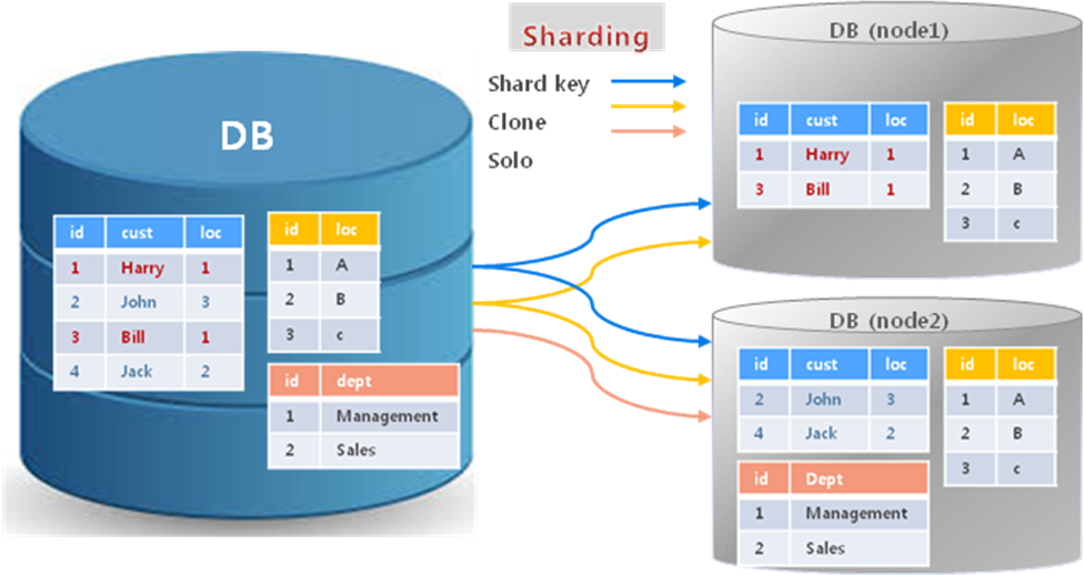 복제 분산 방식은 객체의 데이터를 분산하는 것이 아니라, 객체 자체를 중복 저장하는 방식이다. 복제 분산 방식을 적용한 샤드 테이블은 join, subquery등 샤드 쿼리의 제약이 거의 없이 사용할 수 있다.