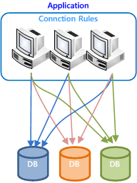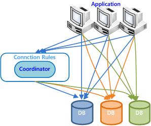 이 구조는 샤딩 확장에 따른 용량과 성능 확장이 가능하고 코디네이터 부하 한계로 인한 제약점이 없다는 장점이 있다. 그러나, 응용 프로그램에서 분산 데이터베이스 접속을 판단하고 통합 질의를 수행해야하기 때문에, 프로그램 작성이 복잡해진다는 단점이 있다.