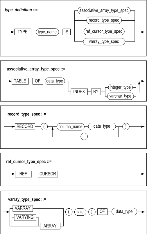 data_type으로 이루어진 Associative Array 타입을 정의한다. INDEX BY 절을 생략하면 기본 데이터 타입은 INTEGER 이다.