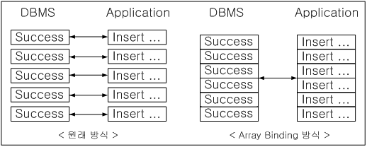 Array Binding은 한 SQL문의 각 파라미터에 대해 배열의 값들을 한꺼번에 서버로 전달하는 방법이다. 이 방법을 사용하면 네트워크 전송 횟수가 줄어들어서 속도 향상을 얻을 수 있다.