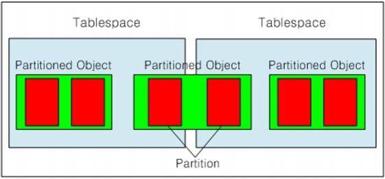 A partitioned object internally consists of multiple partitions. Each partition has the same constraints as nonpartitioned objects, and one partition only depends on a single tablespace.