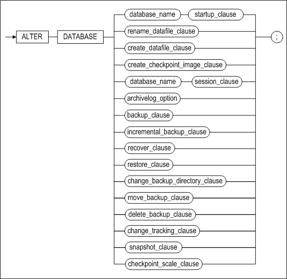 startup_clause ::=, rename_datafile_clause ::=, create_datafile_clause ::=, create_checkpoint_image_clause ::= session_clause ::=, archivelog_option ::=, backup_clause ::=, incremental_backup_clause ::=, recover_clause ::=, restore_clause ::=, change_backup_directory_clause ::=, move_backup_clause ::=, delete_backup_clause ::=, change_tracking_clause ::=, checkpoint_scale_clause ::=